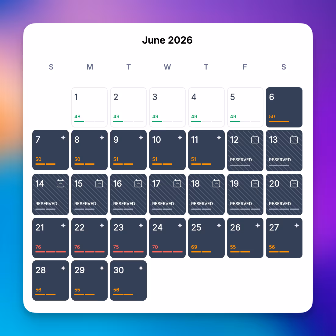 Book up to six months in advance— while keeping your most valuable nights and peak seasons protected. More freedom for travelers. Zero compromise for hosts.